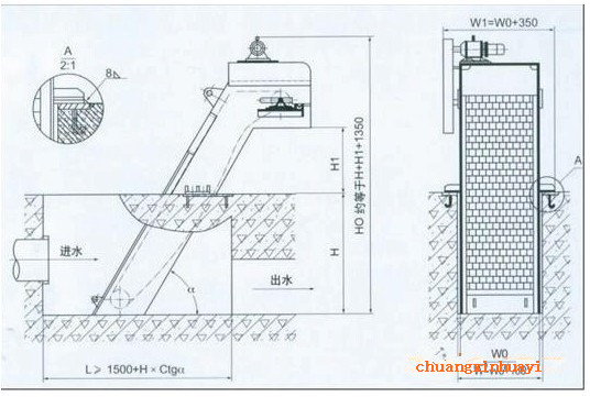 電機(jī)、減速機(jī)驅(qū)動(dòng)機(jī)構(gòu)安裝在機(jī)架上部的左側(cè)或右側(cè),減速機(jī)輸出軸上的鏈輪,通過鏈輪帶動(dòng)鏈耙牽引機(jī)構(gòu)的主動(dòng)鏈輪旋轉(zhuǎn),從動(dòng)鏈輪的作用是張緊耙鏈安裝機(jī)架尾部,由安裝齒耙的鏈條牽引回轉(zhuǎn),從而帶動(dòng)安裝在兩牽引鏈條之間的齒耙一起回轉(zhuǎn),每個(gè)耙齒都插在柵條縫隙內(nèi),將攔截的污物耙送到機(jī)架上部極限位置時(shí),齒耙隨鏈條換向而翻轉(zhuǎn),齒耙上的污物自動(dòng)落入垃圾小車或其它輸送設(shè)施上運(yùn)走。同時(shí)另設(shè)的一對膠板刷對每排經(jīng)過這里的齒耙作清污工作,至此,完成一個(gè)清污的循環(huán)工作。