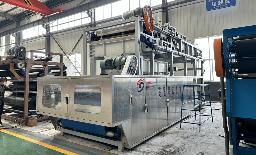 該設(shè)備是我公司在傳統(tǒng)帶式壓濾機(jī)基礎(chǔ)上,研發(fā)生產(chǎn)的全新一代污泥深度脫水機(jī)。設(shè)備增加了液壓裝置、污泥布料裝置,優(yōu)化了調(diào)偏裝置、沖洗裝置和軸承座。新型超高壓帶式污泥脫水機(jī)脫水能力更強(qiáng),可以在不添加或者少添加輔料的情況下,將污泥含水率降至60%以下。