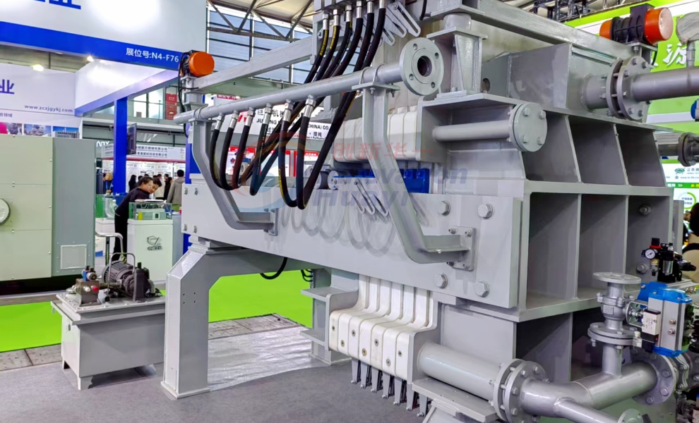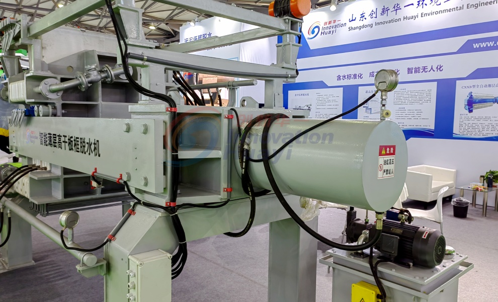 該機(jī)型是我公司研發(fā)生產(chǎn)的全新一代污泥深度脫水機(jī)。設(shè)備濾板可一次性全部拉開(kāi),并可以實(shí)現(xiàn)濾布整體振打,實(shí)現(xiàn)快速卸料,卸料完畢后設(shè)備所有濾布同時(shí)進(jìn)行沖洗;擠壓隔膜采用橡膠膜片,有更好的伸縮性,不需要腔室內(nèi)的污泥完全硬化,就可以進(jìn)行隔膜壓榨,提高了運(yùn)行效率,同時(shí)由于腔室內(nèi)的污泥沒(méi)有完全硬化,所以壓榨完后的濾餅會(huì)更薄更均勻,不存在濾餅中間含水率高的情況,含水率大大降低。