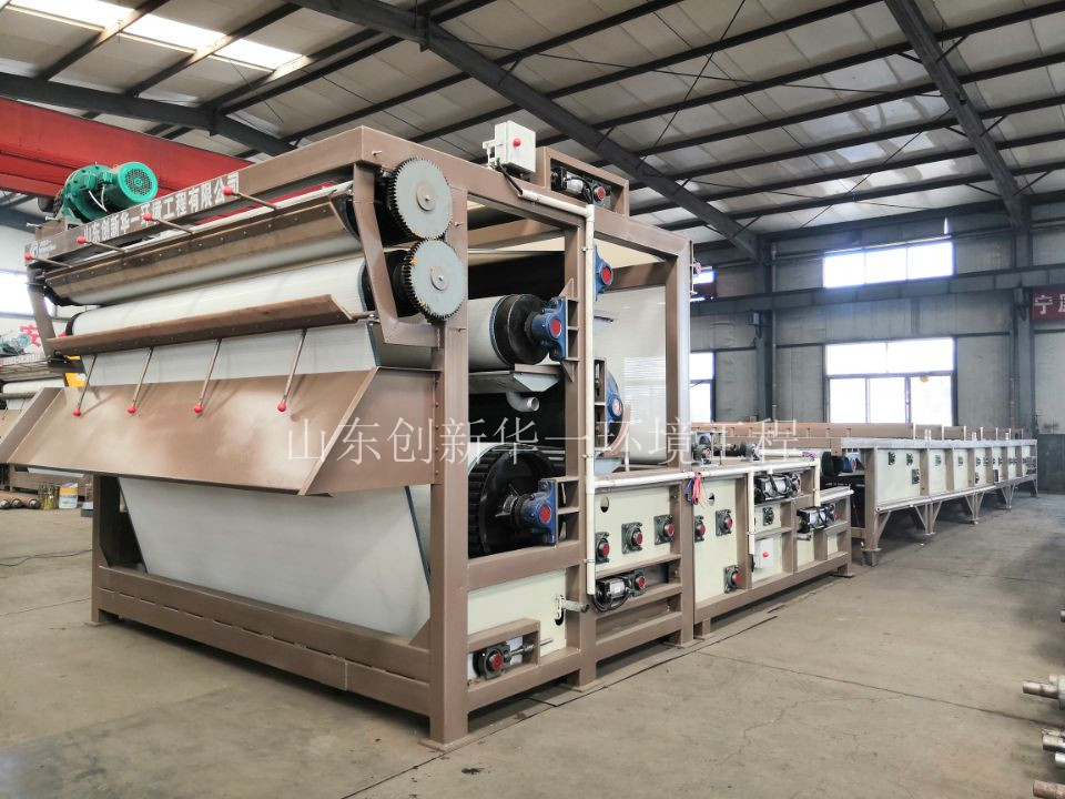 帶式壓濾機(jī)是一種常見(jiàn)的污泥處理設(shè)備,屬于壓力過(guò)濾設(shè)備。帶式壓濾機(jī)是將經(jīng)沉淀濃縮的物料在靜態(tài)混合器中與絮凝劑混合形成絮團(tuán)并分離出自由水,在上下網(wǎng)帶的夾持下,通過(guò)由小到大的擠壓和剪切作用,釋放出絮團(tuán)內(nèi)的自由水和毛細(xì)管水,形成致密的濾餅,達(dá)到固液分離。