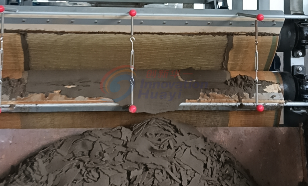破壁后的污泥經(jīng)布料器均勻地分布在重力脫水區(qū),依靠自身的重力脫去部分水份;污泥進(jìn)入預(yù)壓脫水區(qū),在呈“S”型分布輥形成的剪切力條件下,漿料所受壓力逐漸提高,脫去物料間的大部分水份;污泥進(jìn)入超高壓脫水區(qū),液壓裝置輸出力可達(dá)100公斤,脫去污泥細(xì)胞內(nèi)的水分,含水率降低至60%以下。