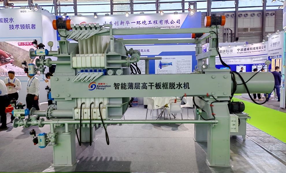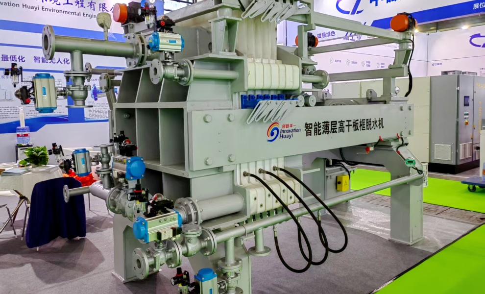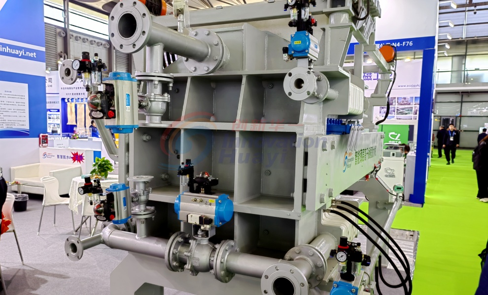 該機(jī)型是我公司研發(fā)生產(chǎn)的全新一代污泥深度脫水機(jī)。設(shè)備濾板可一次性全部拉開(kāi),并可以實(shí)現(xiàn)濾布整體振打,實(shí)現(xiàn)快速卸料,卸料完畢后設(shè)備所有濾布同時(shí)進(jìn)行沖洗;擠壓隔膜采用橡膠膜片,有更好的伸縮性,不需要腔室內(nèi)的污泥完全硬化,就可以進(jìn)行隔膜壓榨,提高了運(yùn)行效率,同時(shí)由于腔室內(nèi)的污泥沒(méi)有完全硬化,所以壓榨完后的濾餅會(huì)更薄更均勻,不存在濾餅中間含水率高的情況,含水率大大降低。